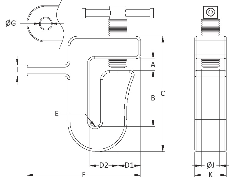 | WLL(TON) | Jaw Opening | A | B | C | D1 | D2 | E | F | øG | I | øJ | K | Weight (Kg) |