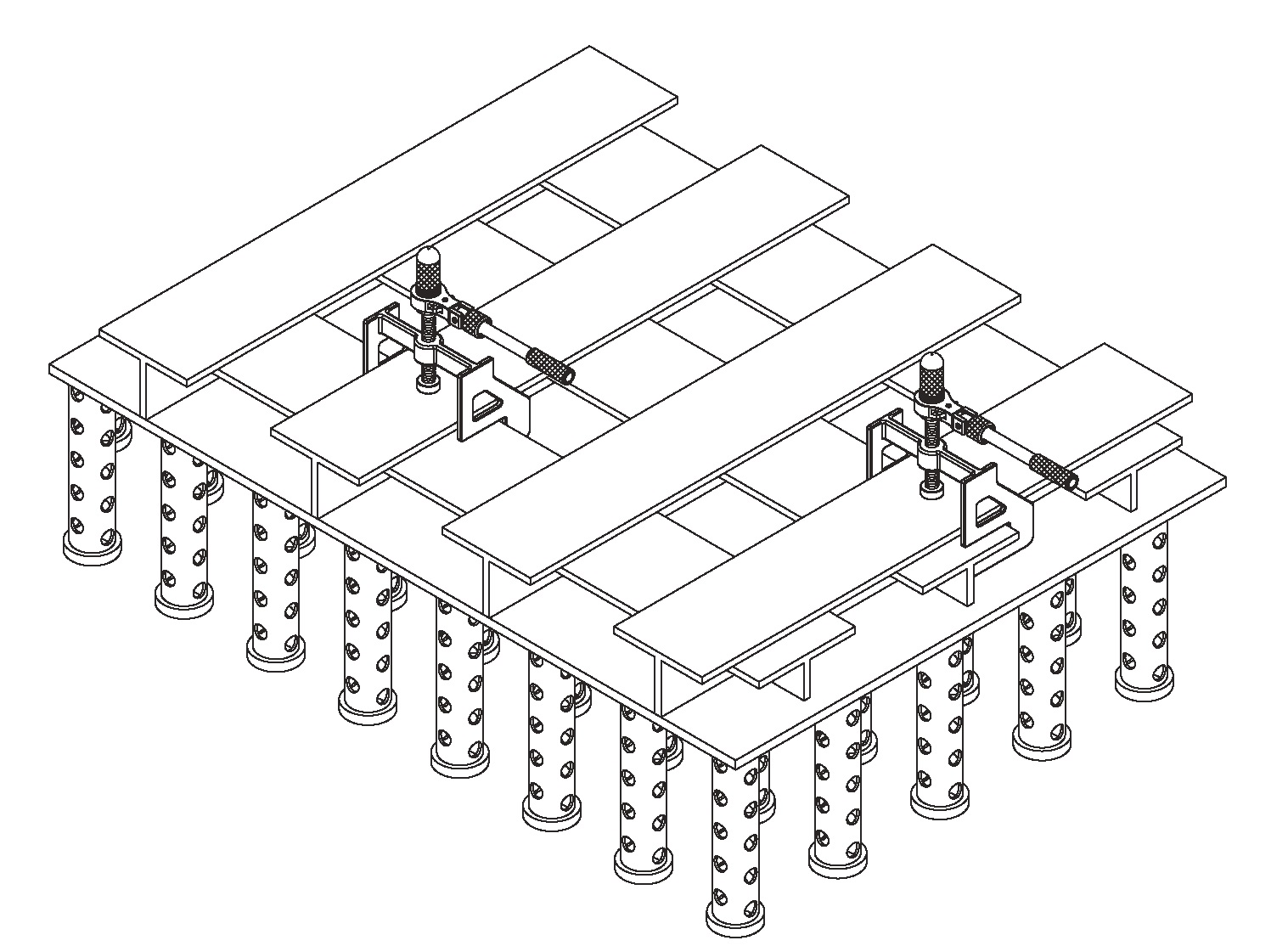 A ratchet press used instead of a jig when attaching L- and T-sections (frames) to the outer plating, the inner plating and the deck of a ship.