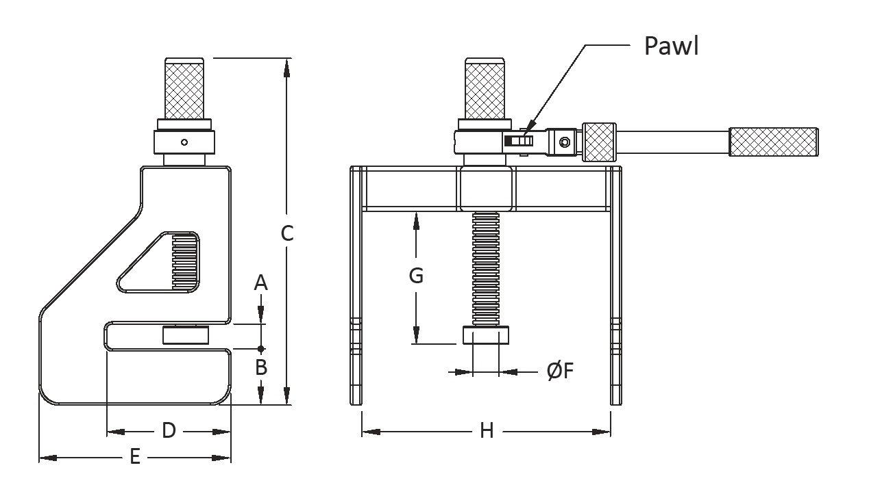 After inserting the press jaw opening into the end part of the section steel flange, push up or down the pawl according to purposes and then operate the handle.