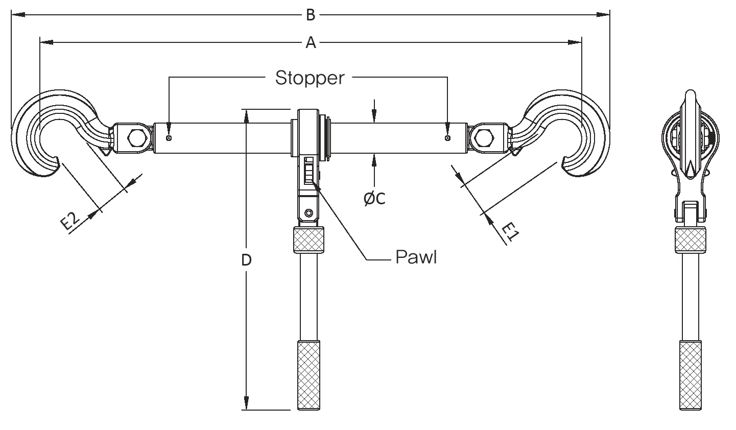 Have a screw clamp bite both ends of a steel block to pull or fix, and insert the hook of the ratchet puller into the eye hole(shackle). Depending on purposes, push up or down the pawl, fix it and then operate the handle.